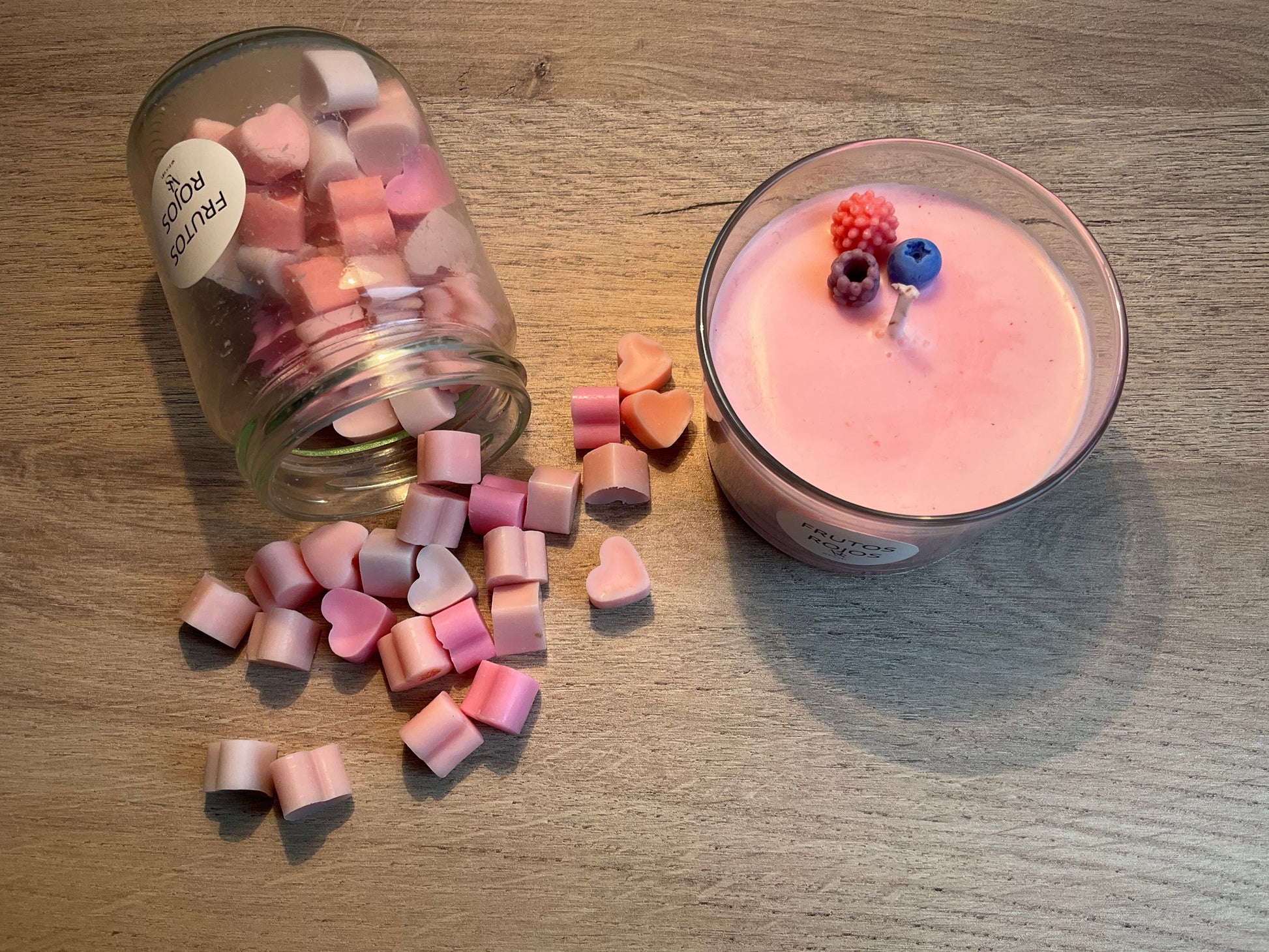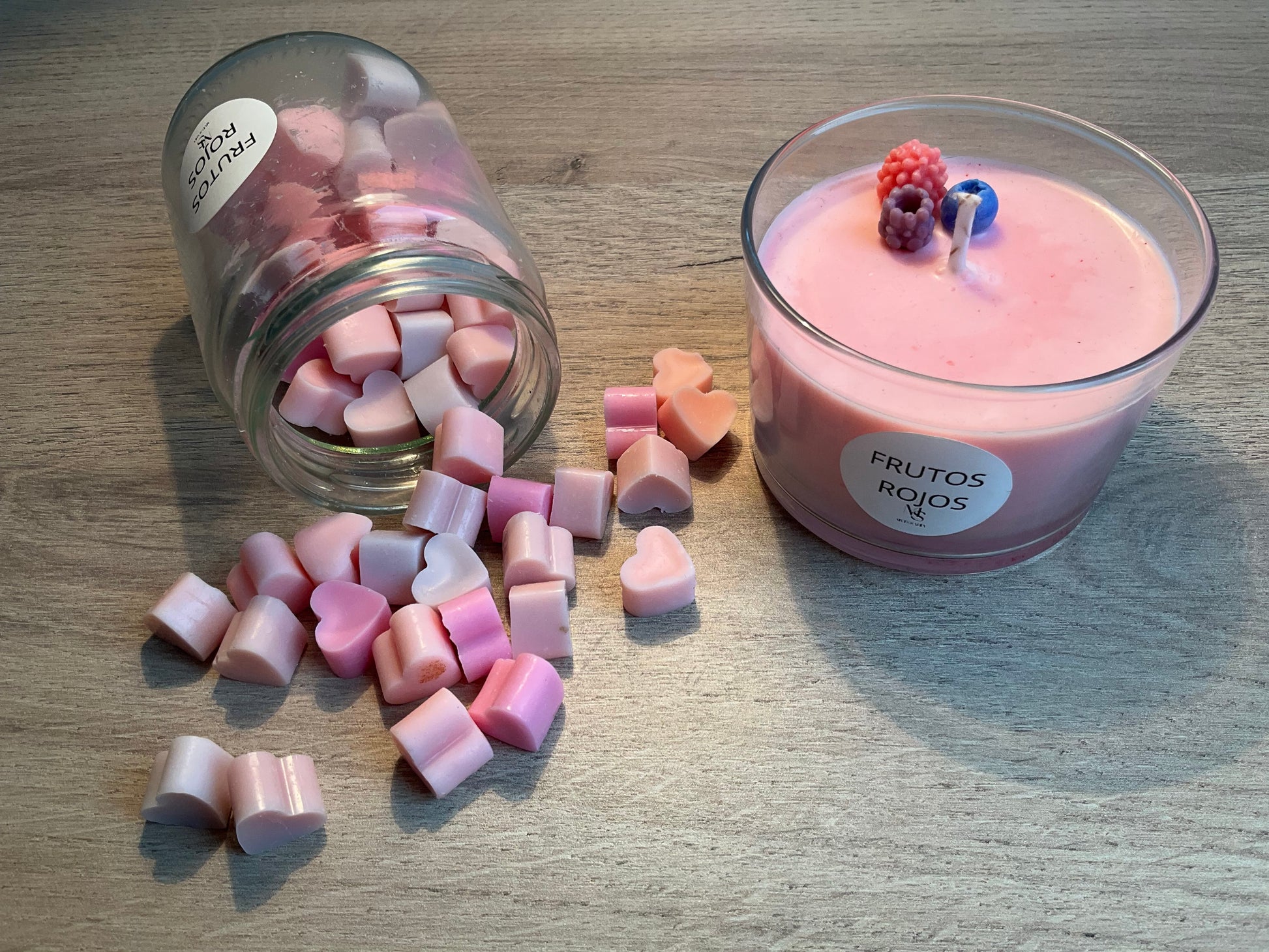 Consta de nuestra vela con olor a frutos rojos y wax melts.