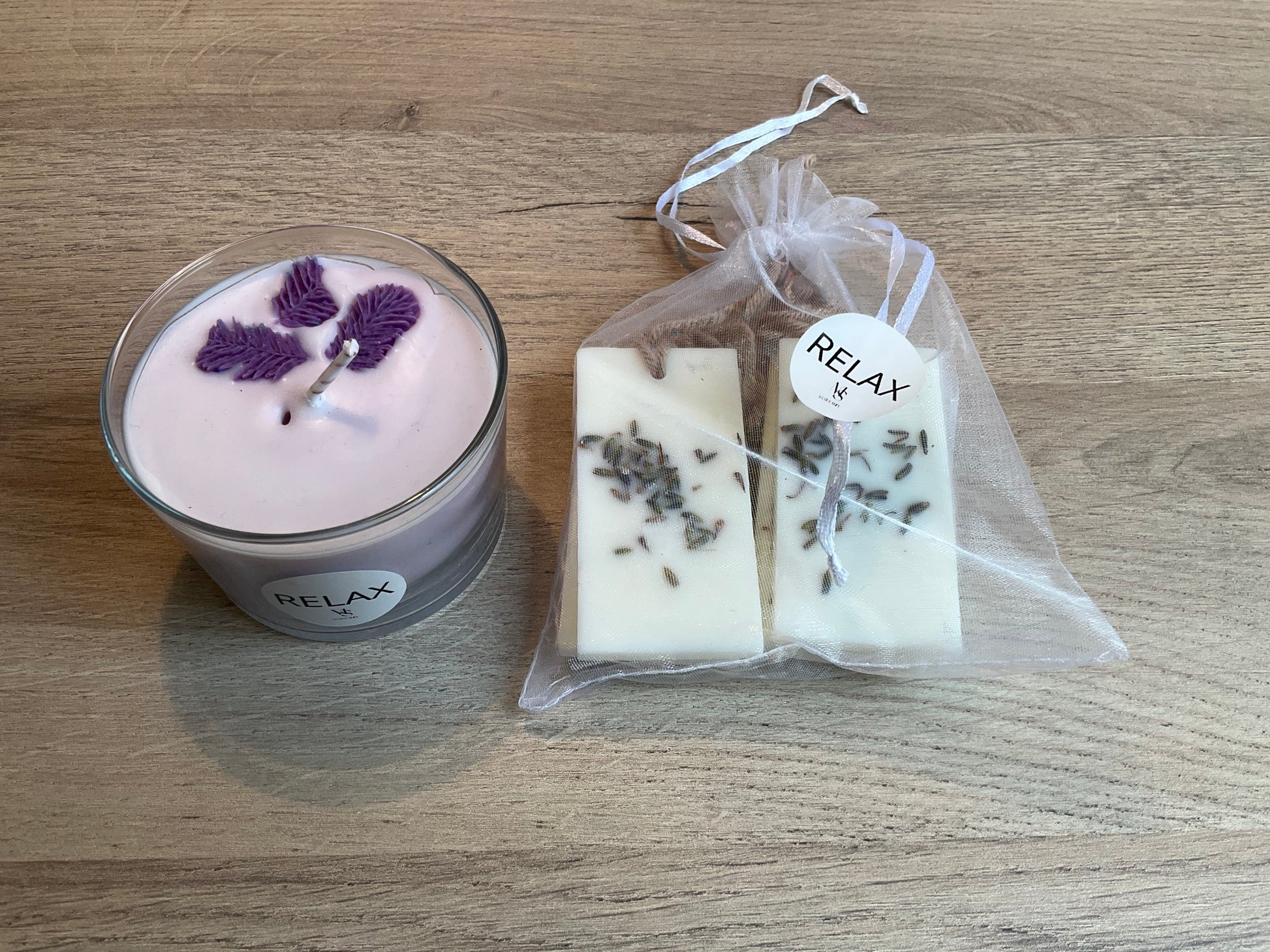 Consta de nuestra vela con olor a relax y nuestro ambientador de armario.